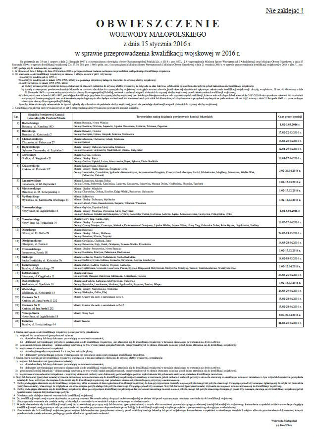 Obwieszczenie Wojewody Małopolskiego z dnia 15.01.2016 r. w sprawie przeprowadzenia kwalifikacji wojskowej w 2016 r.