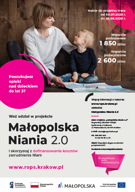 Regionalny Ośrodek Polityki Społecznej w Krakowie w związku z realizacją Projektu „Małopolska Niania 2.0” współfinansowanego ze środków Europejskiego Funduszu Społecznego, Oś Priorytetowa 8 Rynek pracy, Działanie 8.5 Wsparcie na rzecz łączenia życia zawodowego z prywatnym Regionalnego Programu Operacyjnego Województwa Małopolskiego na lata 2014-2020 ogłosił TRZECI NABÓR DO PROJEKTU „MAŁOPOLSKA NIANIA 2.0”.
