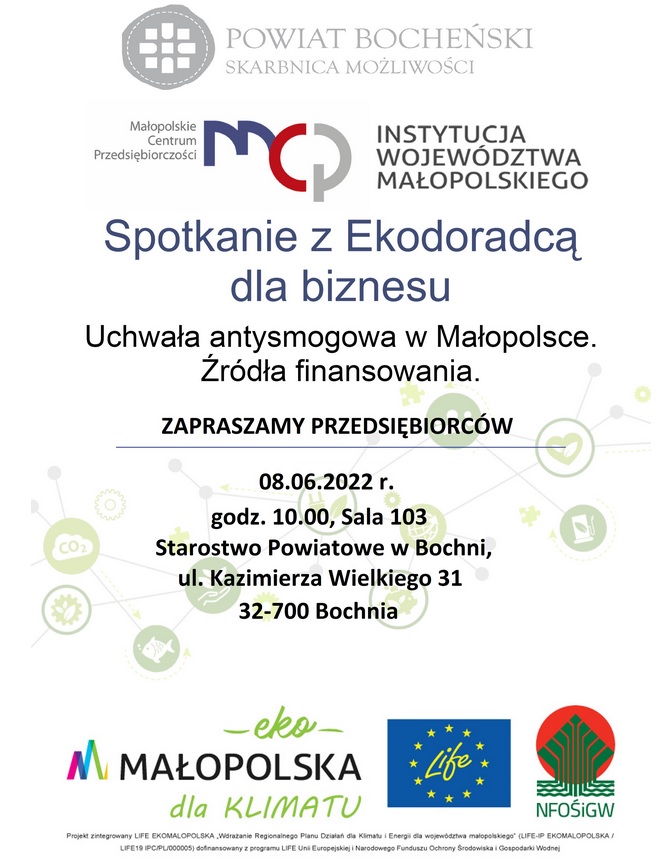Zapraszamy przedsiębiorców z terenu Powiatu Bocheńskiego do wzięcia udziału w bezpłatnym spotkaniu z ekodoradcą dla biznesu z Małopolskiego Centrum Przedsiębiorczości, które odbędzie się w dniu 08 czerwca o godz. 10.00, w sali 103 w budynku Starostwa Powiatowego w Bochni.